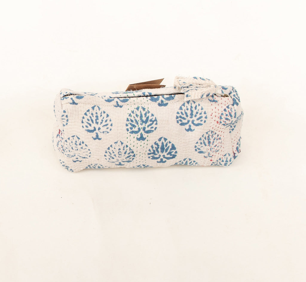 Details: Material: 100% vintage sari fabric (white/cream with block print), Size: 17 × 25 cm, Closure: durable zipper, Origin: handmade in India