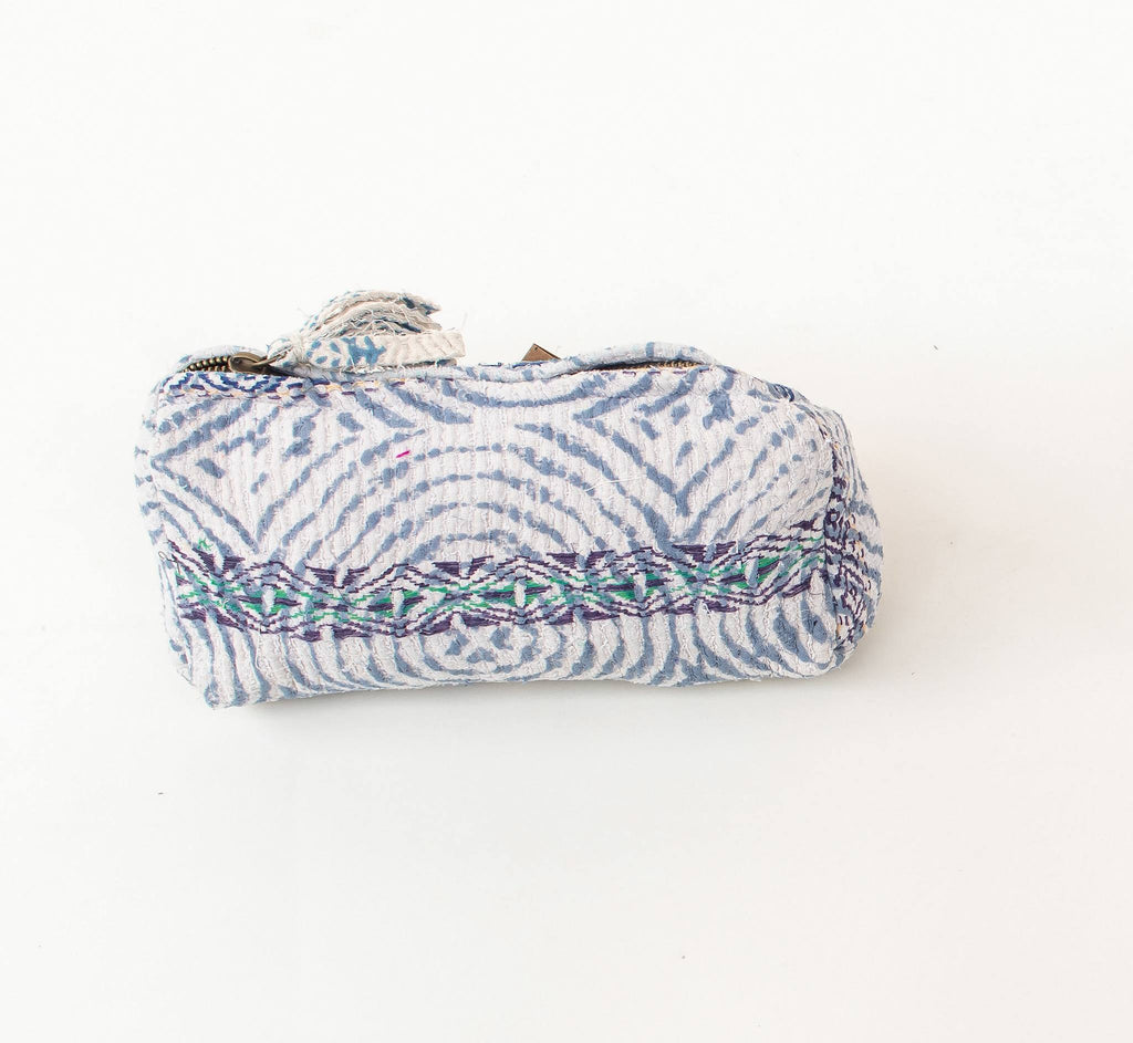 Details: Material: 100% vintage sari fabric (white/cream with block print), Size: 17 × 25 cm, Closure: durable zipper, Origin: handmade in India