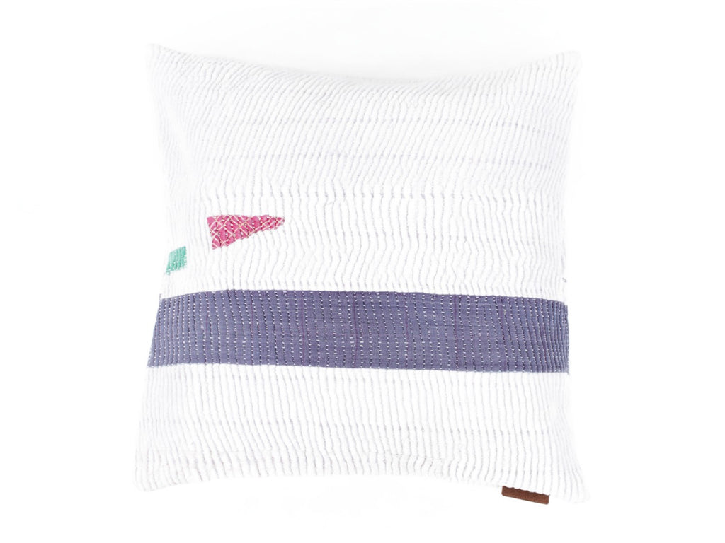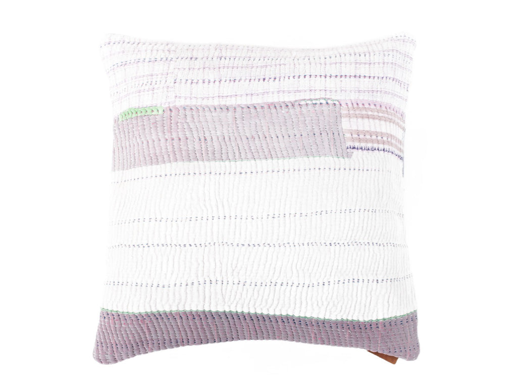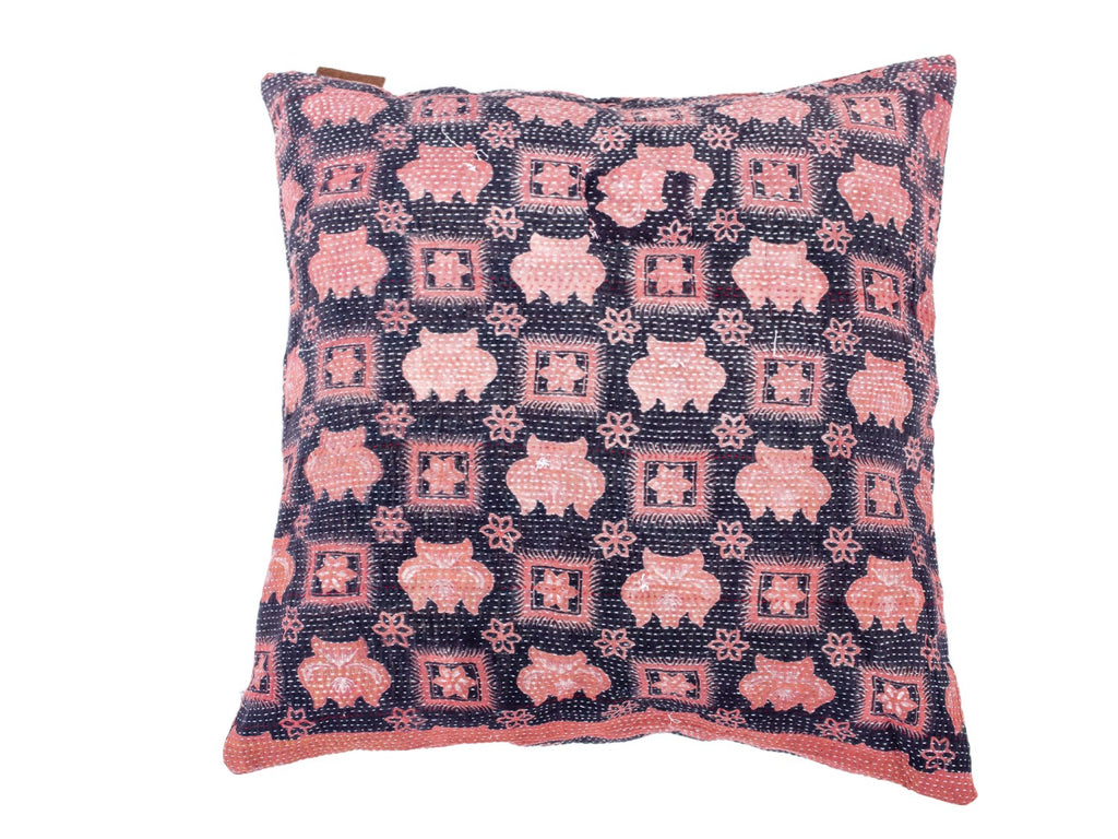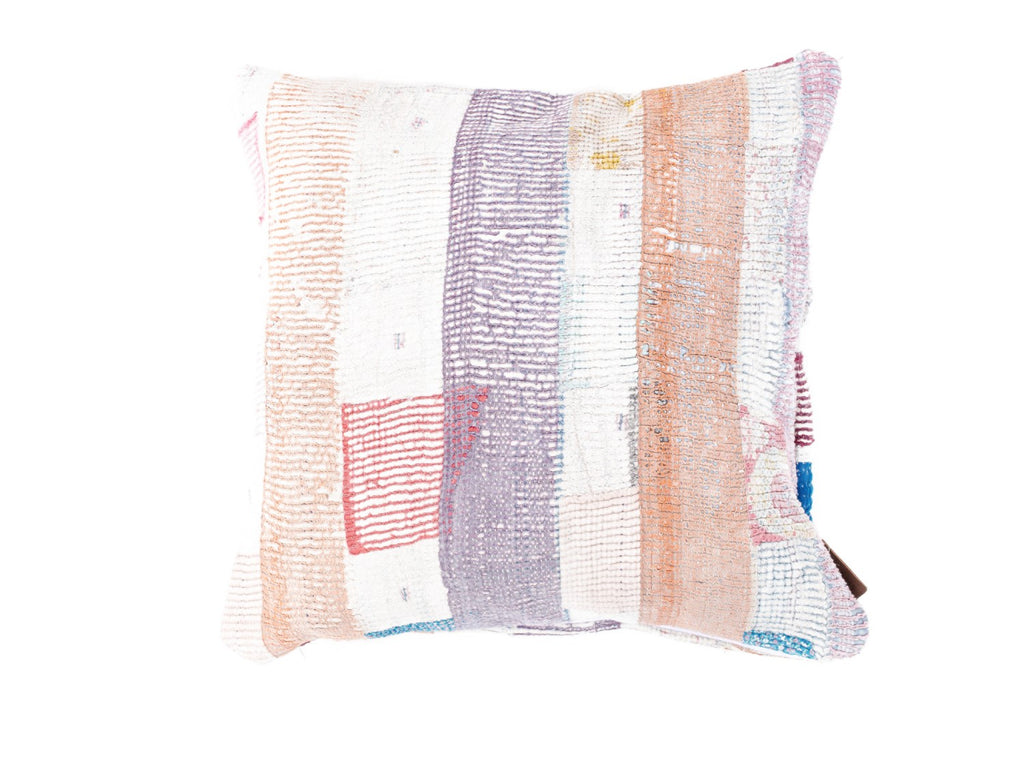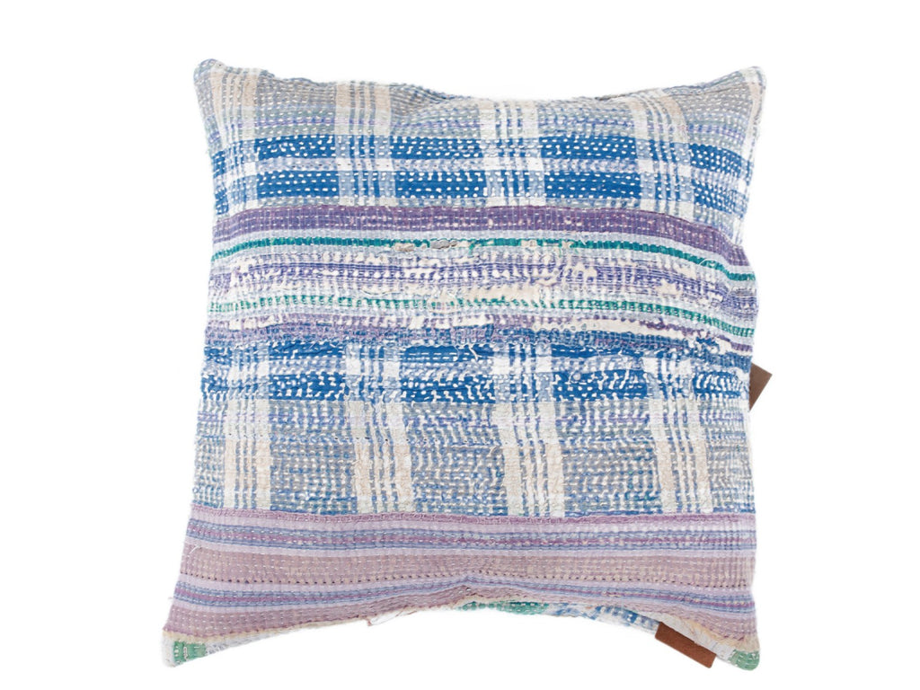 Fine Q are Sari cushions produced from a type of sari that has a different expression than our normal Sari Kantha cushions. They are made of thick recycled cotton sari laid together with several layers in between and with a worn look, where the saris inside help to give the whole pillow a very raw vintage look. They are toned down in colors and patterns and are sewn with smaller and tighter Kantha stitches, which give them an authentic look..